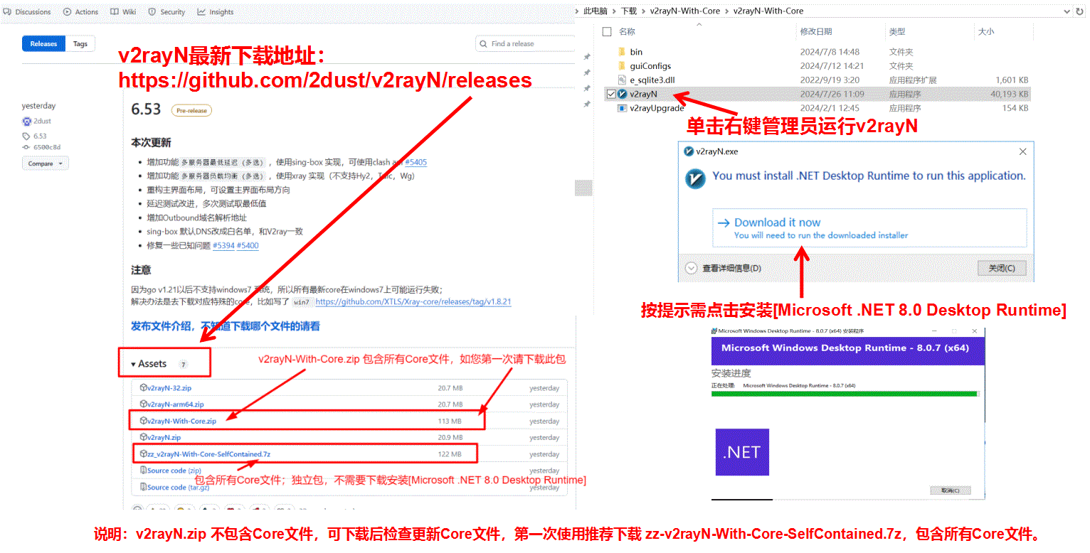 1.如您第一次请下载此包 v2rayN-With-Core.zip 包含所有Core文件,若按提示需安装[Microsoft .NET 8.0 Desktop Runtime]