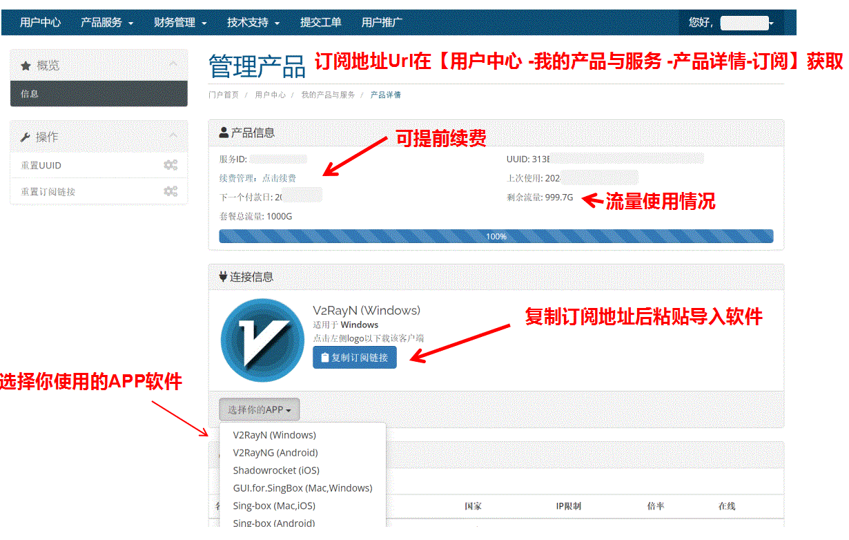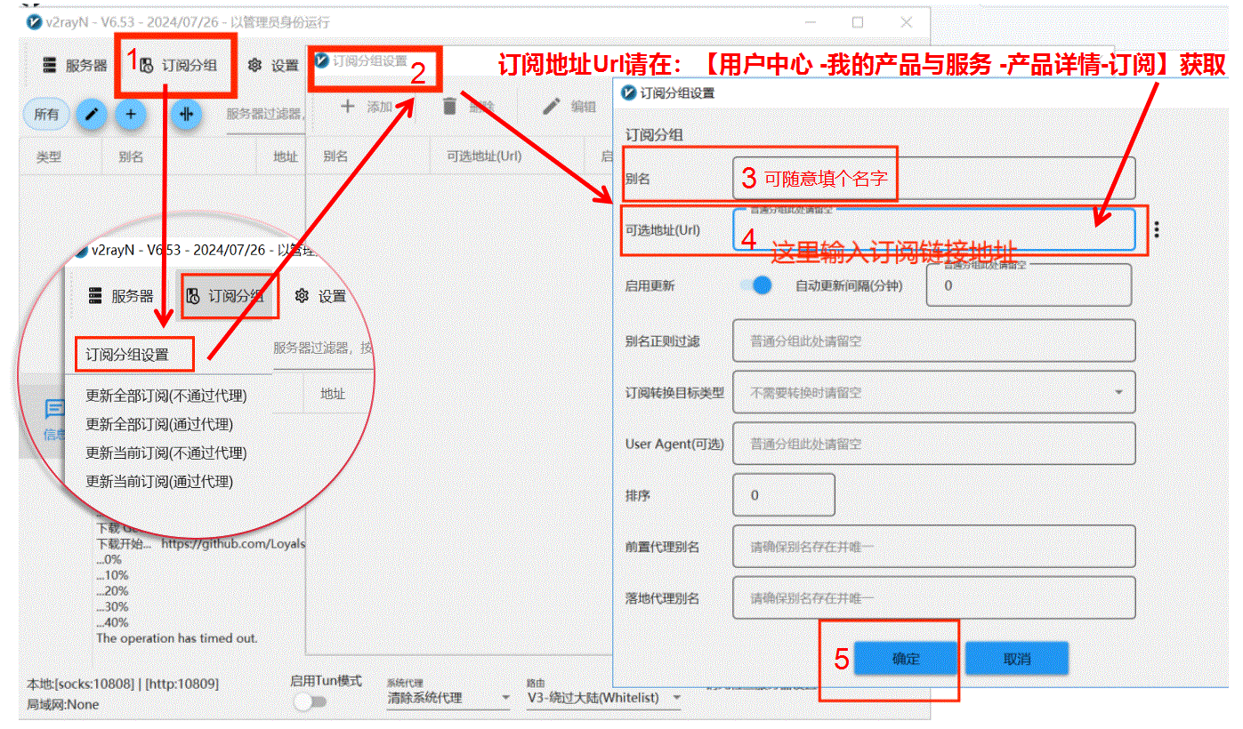 [3] 登录网站-用户中心-我的服务 -产品详情页面-获取复制订阅地址-粘贴订阅地址-右下角【确定】