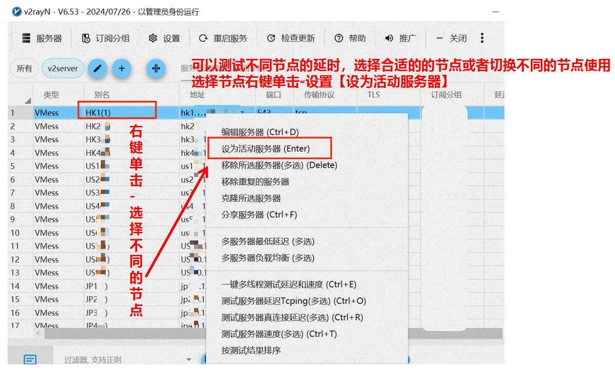 [5] 选择不同的节点右键单击-设置【设为活动服务器】,即可选择指定的节点使用