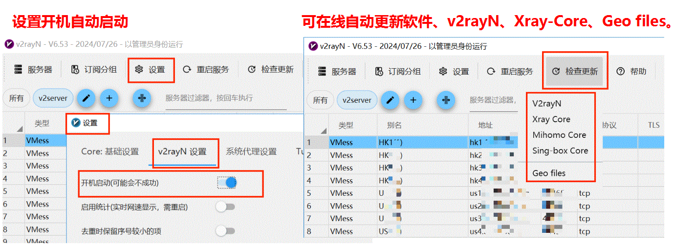 [7] 设置开机启动,在线更新等,若下载软件无Core完整包,请务必更新V2ray-Xray-Core才可以使用